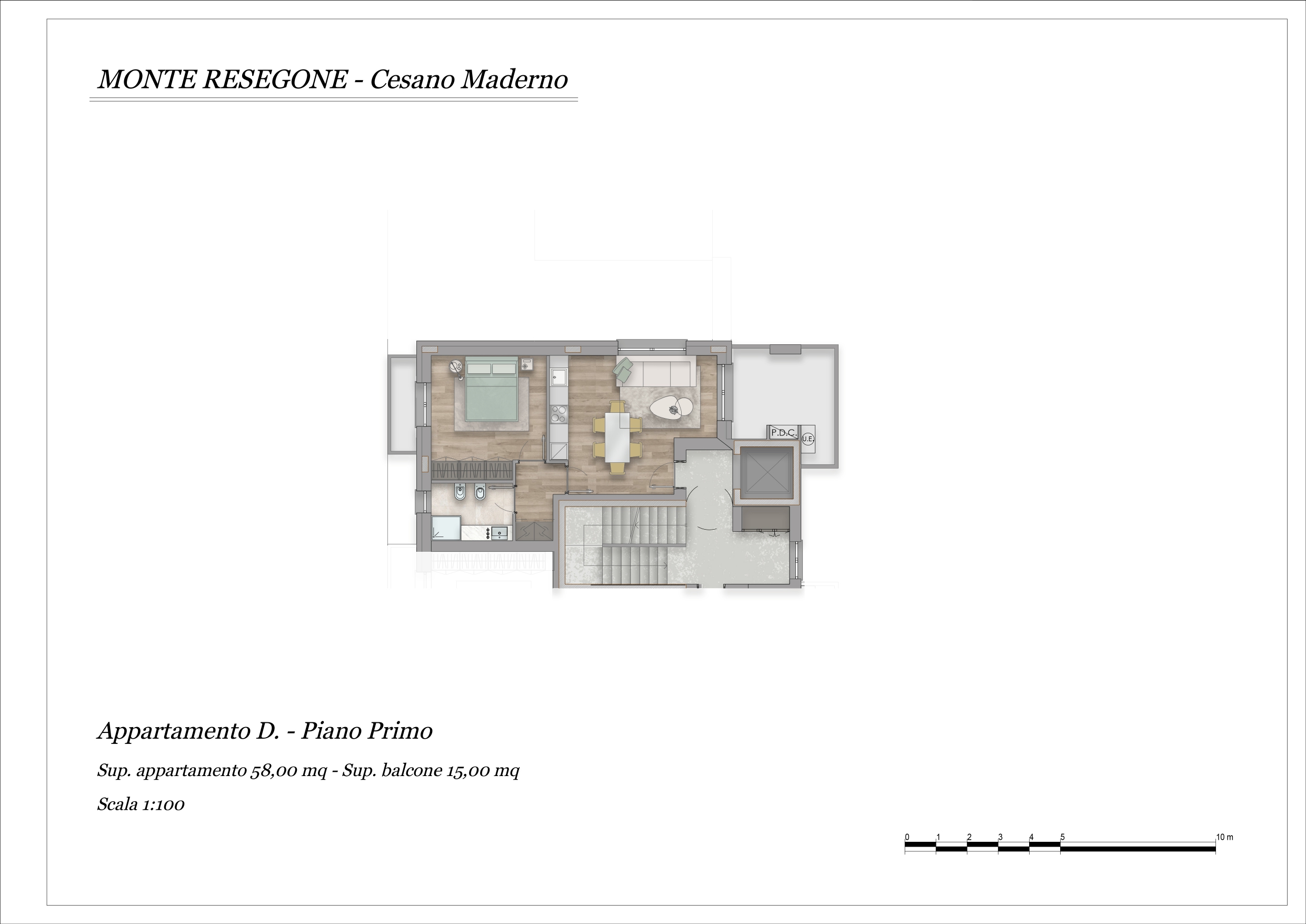 Al primo piano un ampio bilocale di circa 58 mq‚ così composto da: Zona living luminosa con cucina a vista‚ Camera matrimoniale spaziosa e ben distribuita‚ Bagno finestrato con finiture moderne‚ Ampio terrazzo di 15 mq ideale per pranzi all’aperto e momenti di relax.