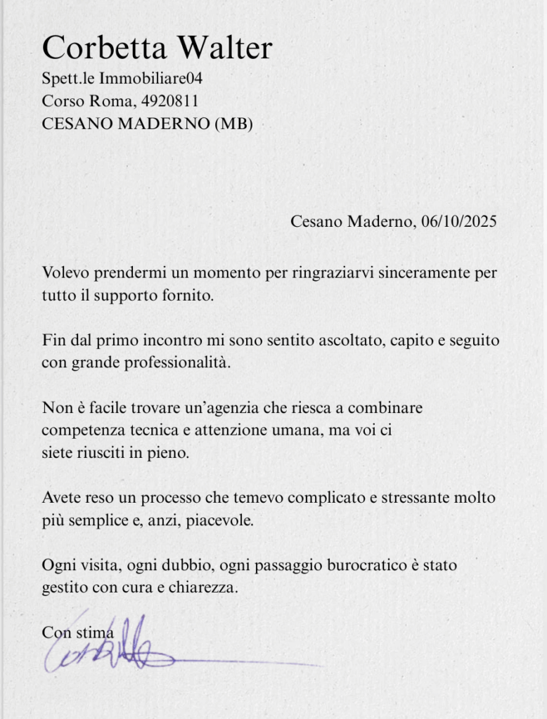 Di seguito una serie di testimonianze di clienti che si sono rivolti ad IMMOBILIARE04 e con cui, oltre ad aver portato a termine l’incarico affidatoci, abbiamo instaurato rapporti di reciproca stima.
